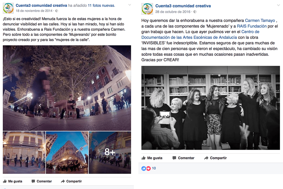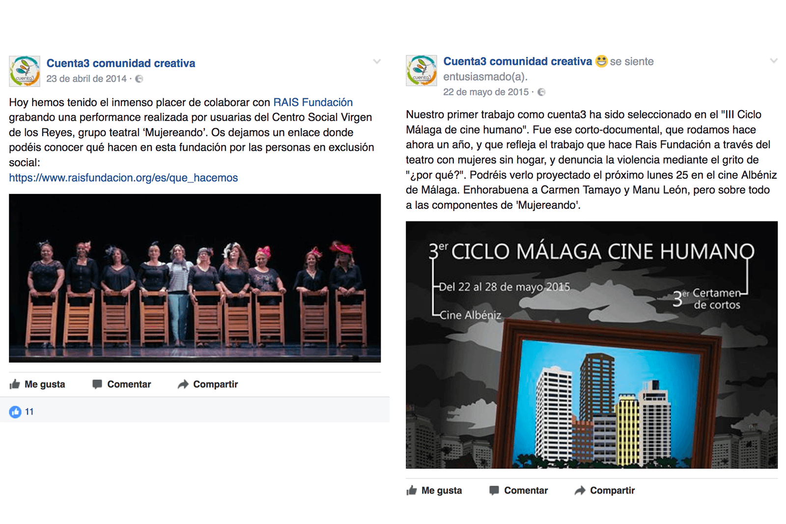 En cuenta3 creemos en una sociedad más justa, y por ello llevaremos a cabo o prestaremos apoyo a proyectos de carácter social: dando soporte a entidades que se dedican a ello, dando visibilidad a poblaciones con exclusión social, o incluso enfocando nuestras creaciones en ese sentido. No hay mejor medio de protesta o visibilización que el teatro, el cine o cualquier otro medio de expresión artística.